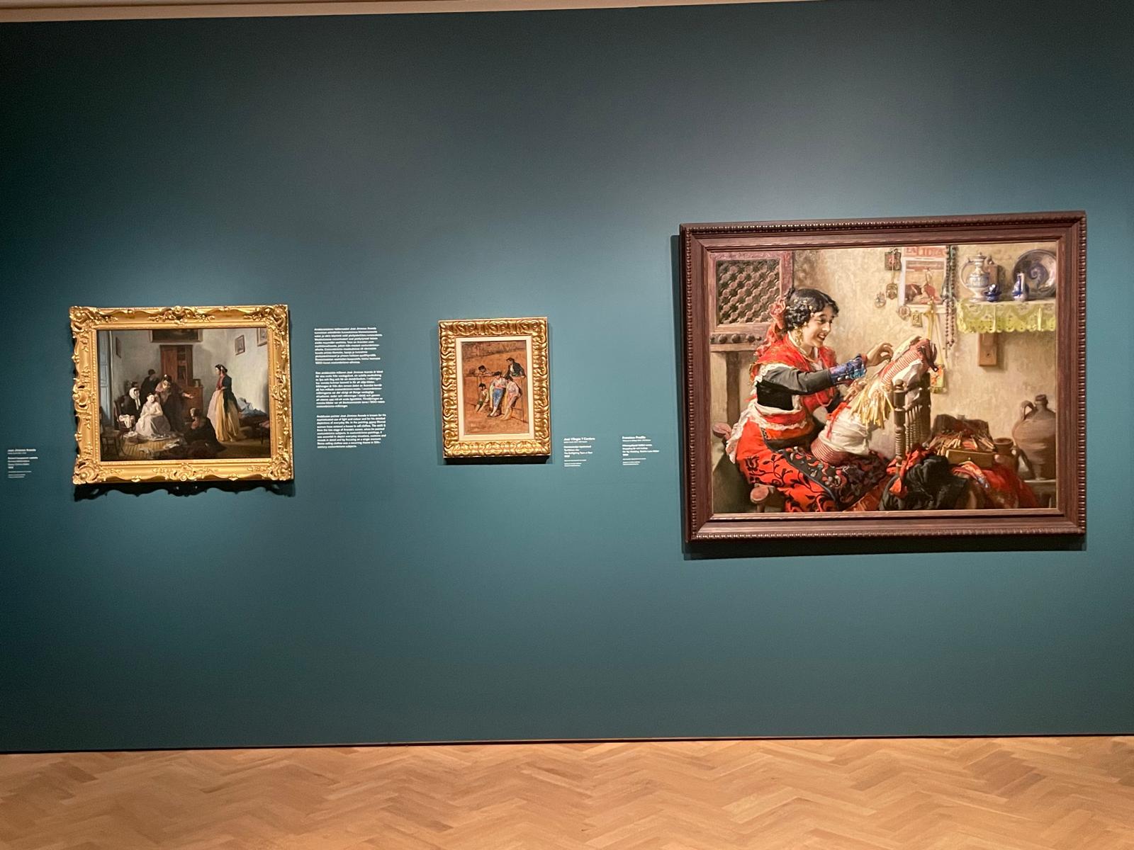 Los temas de estas obras se inspiran particularmente en la cultura de la región andaluza. Estas imágenes también están ligadas a atributos e ideales fantasiosos e irreales. Las pinturas resaltan las tradiciones del país, su gente y los estilos de sus diferentes regiones. Detrás de las situaciones evocadoras en las pinturas de José María Gallegos y Arnosa (1857-1917) y Francisco Pradilla (1848-1921) también hay un enfoque en la artesanía. Los artistas se inspiraron aún más en el orientalismo, es decir, en motivos exóticos y orientales que también se encuentran en sus propias regiones locales. Los viajes que se extienden a la culturalmente diversa Andalucía, o incluso a África, son evidentes en las obras de Mariano Fortuny (1838-1874) y Joaquín Agrasot (1836-1919). Los grabados de Francisco de Goya (1746-1828), por su parte, en lugar de glorificar la cultura española, aportan una nota de crítica social.
